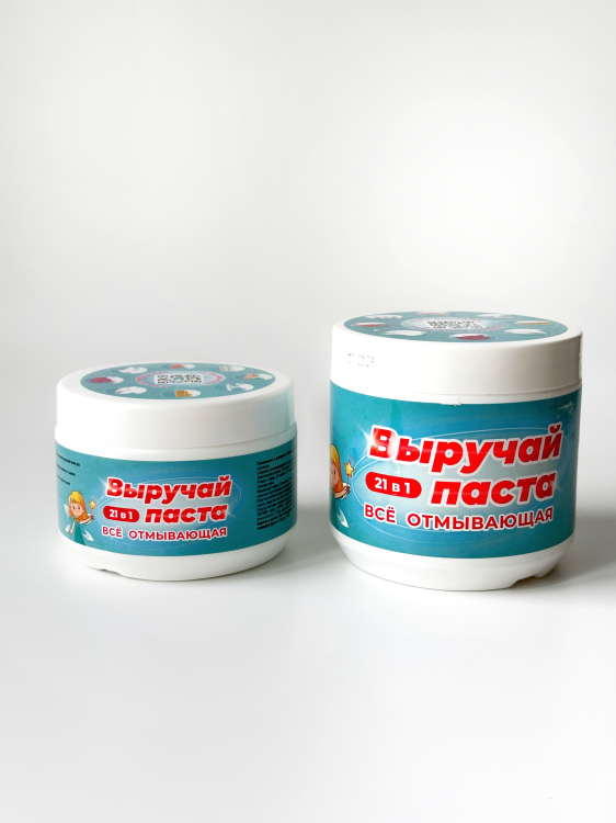 «Выручай паста 21 в 1» – универсальное средство для стирки и уборки. Удаляет пятна, жир, запахи, восстанавливает белизну и подходит для ручной и машинной стирки, а также для чистки обуви и поверхностей.